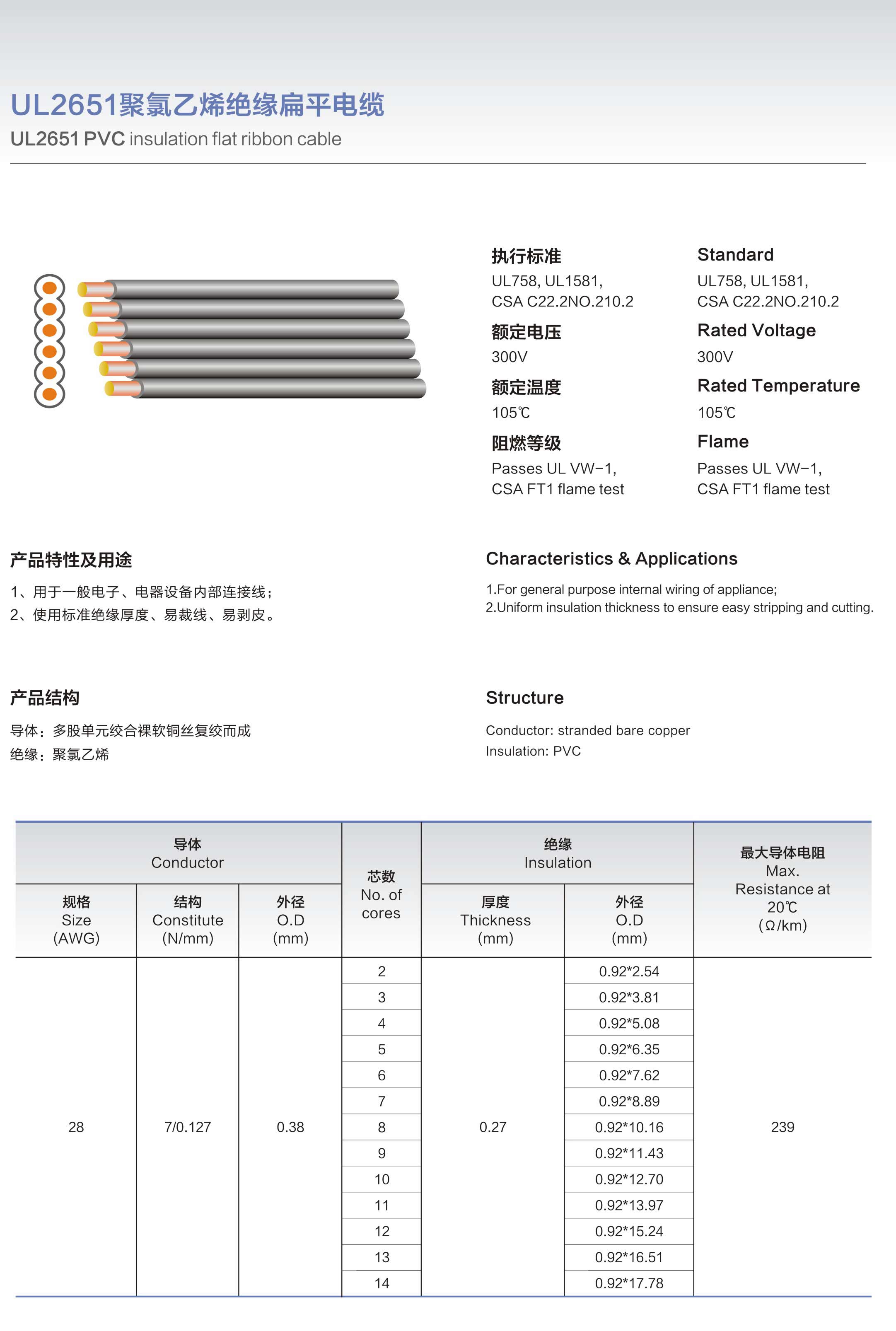 UL2651聚氯乙烯绝缘扁平电缆