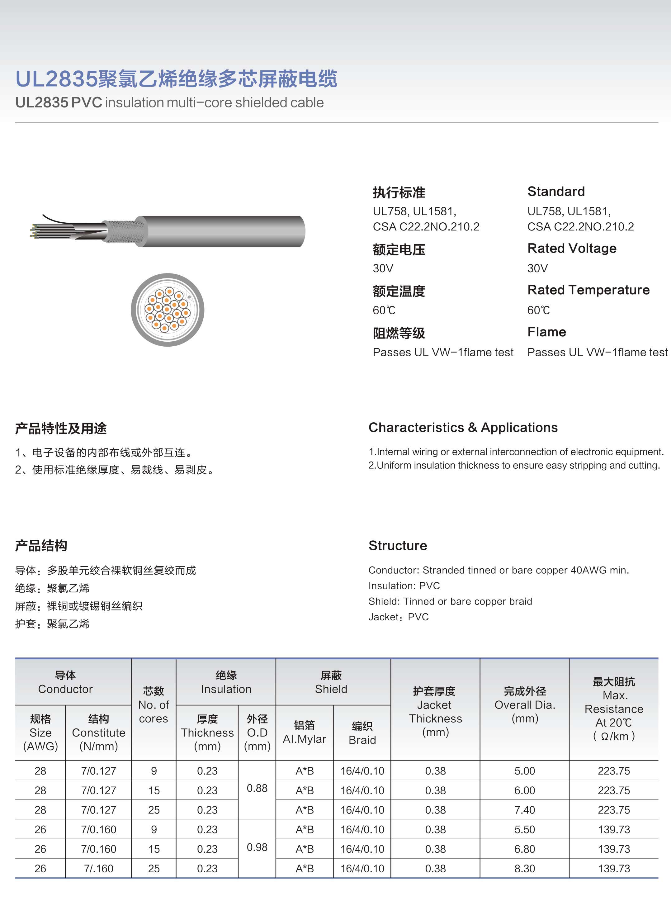 UL2835聚氯乙烯绝缘多芯屏蔽电缆