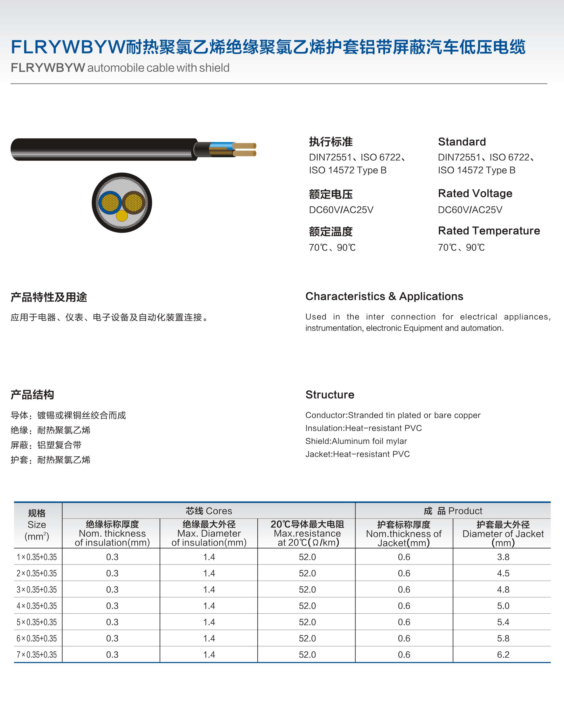 FLRYWBYW耐热聚氯乙烯绝缘聚氯乙烯护套铝带屏蔽汽车低压电缆