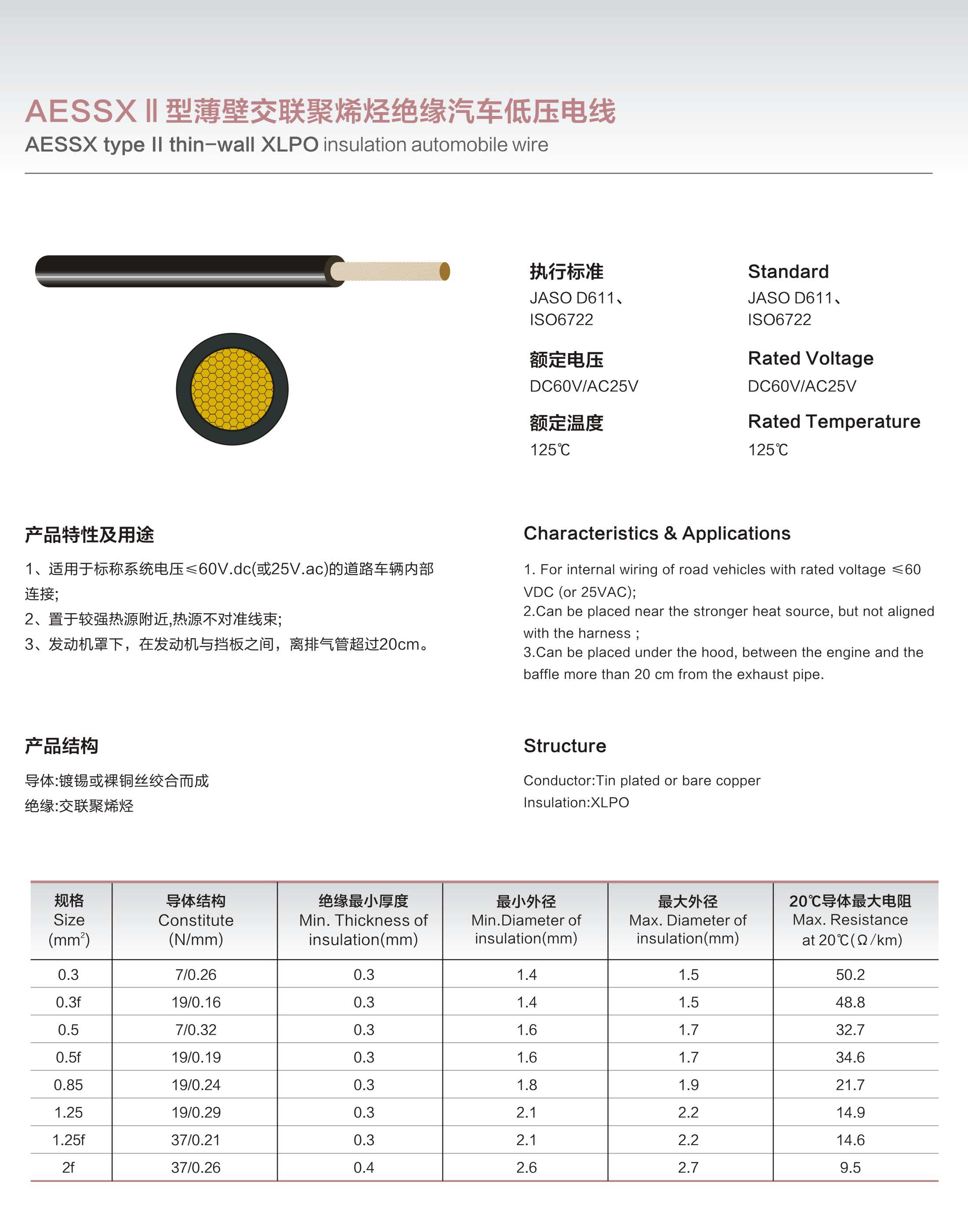 AESSXI型薄壁交联聚烯烃绝缘汽车低压电线